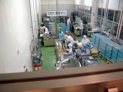 見学コーナーになっていて、アノ『三方六』が大量に生産されていました。 ココは両端を切断し、機会カットの後、人の手で綺麗に整形しているところです。
