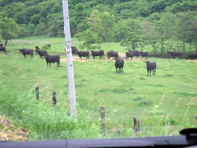 遠くに牛が見えたので、車を止めて相方が牛を呼んでみる。 すると、いきなり全力疾走する牛たち。