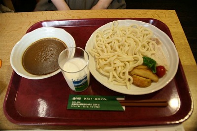 美瑛駅に着いたら腹ごしらえ。近くにある道の駅で「美瑛名物=カレーつけ麺」を堪能。そして牛乳つき(結構濃くておいしかった) ええ〜っっ!!