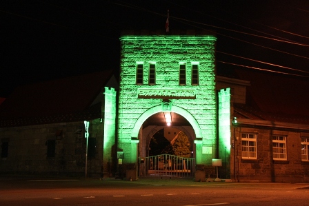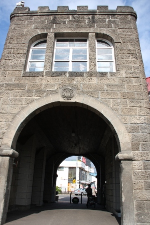 中から見た正面玄関。 正面玄関は夜にはライトアップ。