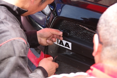 アドバンのテントでは車の前に人が集まり何やら作業中。 フロントグリルにカメラを取り付けています。