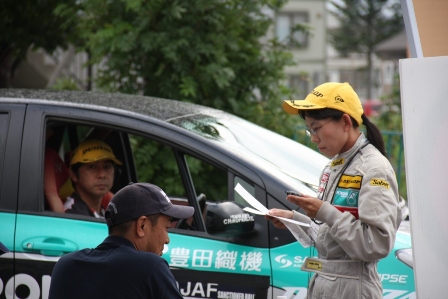 オフィシャルの持つボードには「静かに」の文字。 今回のラリーでは音がうるさいと苦情があったそうです。