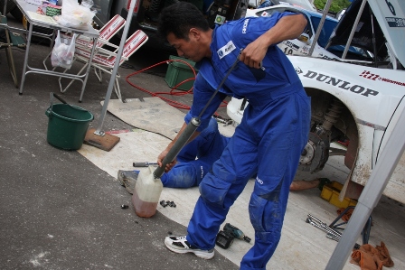 松岡選手はタービンのパイプが割れと3速ギアの破損、ギアの損傷を最小限度に抑えるために、ギアボックスのオイル交換。