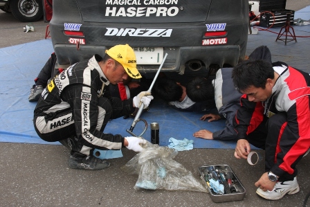 福永選手もリアデフのケースが割れてオイル漏れ。応急処置をしてオイルを補充して様子を見ながら走ることに。
